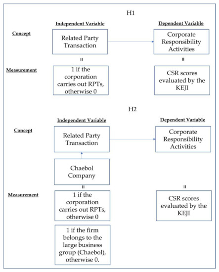 Moreover, the controlling shareholders of a firm that engages in RPTs do not want the disclosure of the company’s information, related to their interests, to the market. Accordingly, Verrecchia reported that these shareholders tended to lower the firm’s disclosure level [28]. Thus, present accounting standards in South Korea require the full disclosure of such related details, because it is clear that individuals who exert a significant influence or exercise substantial control over a firm might obtain unfair benefits through RPTs. CSR activities might exhibit a positive relationship with RPTs if the CSR activities are abused as a tool to conceal illicit corporate conducts, pursue personal interests, or increase the reputations of the controlling shareholders and managers under their control. When engaging in transactions that are accompanied by agency problems, such as RPTs, firms would engage in CSR activities much more actively than other firms if such firms intend to embellish their corporate image and if their managers intend to build their reputation through CSR activities. Thus, the following hypothesis is formulated: