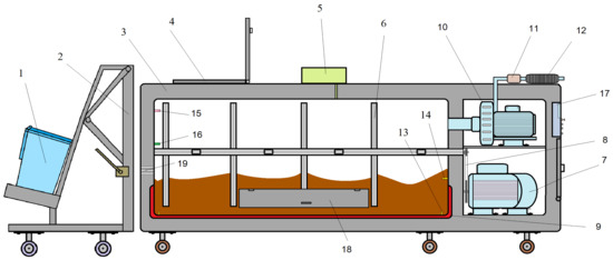 Operating principle of the automatic equipment used for decentralized composting of organic waste: 1—recycle bin, 2—hydraulic actuation tipping equipment, 3—composting reactor, 4—the feeding door, 5—inoculum/enzyme dosing, 6—blades mechanism, 7—electric motor, 8—driving mechanism, 9—ceramic heating system, 10—air pump, 11—gas analyzer, 12—deodorizing filter, 13—heater temperature sensor, 14—waste temperature sensor, 15—moisture sensor, 16—volume sensor, 17—command-and-control panel, 18—outlet door, 19—air inlet.
