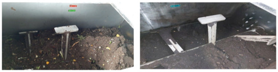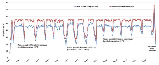 Given the high importance of temperature in the process, it is preferable that the composting equipment to be positioned in a heated area, inside the buildings during the winter. The influence of the waste temperature was also found to be important, both for the time period needed for a complete cycle, as well as for the additional energy consumption. During the winter, the frozen waste introduced into the process showed at least an additional 45 min of heating to the maximum power. Storing wet waste outside the building in the summer can generate unpleasant odors and potentially hazardous leachate, so it is also to be avoided. In the experiments carried-out, no disturbances in the system operation were determined due to the temperature of the waste or to the environment, but only on the time and cost of processing. The proposed temperature variation regime proved to cover the daily necessary dehumidification levels, for the proposed feeding management (2235 kg in 14 days of treatment). The preset variation range was not always respected, especially due to the thermal inertia of the waste, which increased with the mass increasing. The sanitizing temperature (75 °C for an hour) has been shown to be effective in destroying all pathogens and seeds present in the fresh material. One observation would be that the waste should be fed at supermarket temperature, given that outdoor storage can cause some reduction in treatment efficiency.