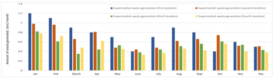 The four supermarkets were chosen as representatives for food retail stores in Bucharest, depending on several basic requirements. They had to fit into the category of small supermarket group, which are usually built-in residential areas (where the generation of unpleasant odors, leached, and pathogen is a major concern). For these stores, the space needed for waste storage is a problem, while the sales of fruits and vegetables are usually higher than average. Two of the supermarket stores were chosen in the city center, while the other two on the periphery area (to flatten the difference that may occur due to differences in living standards between residents). All stores maintain a strict waste reporting and have implemented selective waste collection in four fractions.