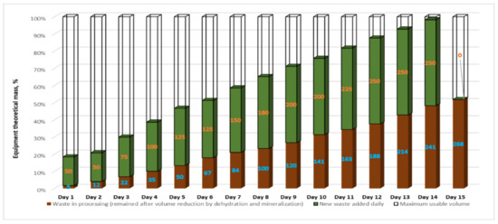 The brown color describes the mass of waste remaining in the equipment after each day of processing, while the green color represents the amount of fresh waste added daily. Equipment theoretical maximum mass capacity has been set to 500 kg (100%); however, the waste was gradually added so that mineralization and dehydration could take place in the best parameters.