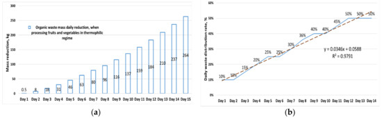 The variation of the daily quantities of organic waste, remaining in the equipment during 15 days of processing in thermophilic regime with moisture extraction, associated to the proposed loading regime, is described in Figure 7.