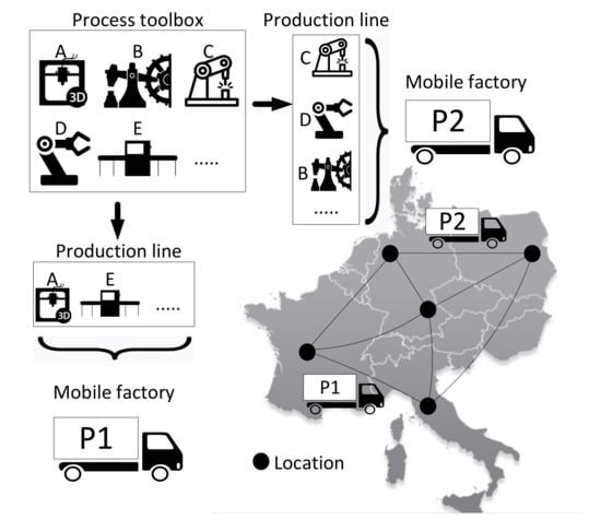 As mentioned in the previous paragraphs, higher levels of flexibility are achieved through the decentralization and reconfiguration of production systems. However, miniaturization and modularization also support mobility. Here, the term mobility is defined as geographical flexibility, meaning that production modules can be relocated between different sites easily and at short notice []. This requires that the production units be portable, meaning that all equipment necessary for production can be dismantled, loaded, transported, and reinstalled in its new position in the shortest possible time. In this context, mobile manufacturing systems (MMS) consisting of production modules have been studied and developed, which can also be combined and reconfigured for the assembly of new products as well as be scaled to reach new volumes. This concept was discussed by Lier et al. [], who presented an overview of the related literature and the opportunities and risks that this new flexibility feature brings. In addition, this concept was investigated within the research project called “Factory-in-a-Box” (FiaB), in which configurable production modules are located in containers, enabling the companies to provide highly customized products at a location of their choice []. Similarly, the concept of Location-Independent Manufacturing (LIM) was introduced by Peltokoski et al. [] as a possible future manufacturing system in which production units can be moved to locations close to customers. In this way, transport costs can be reduced, as only a mini-factory needs to be moved and not several finished products. This concept is closely related to FiaB. However, the main difference is that LIM focuses primarily on investigating realistic business operation possibilities, whilst the concept of FiaB examines more technical aspects []. Mobile manufacturing systems were also addressed by Fox [,], who discussed the extent to which MMS can increase location diversity, decentralizing production in a more ecological and social manner. The FiaB concept has also been formulated mathematically. Jiang et al. [] developed a mathematical model for the joint planning of subassembly modules and network design, and Pasha et al. [] addressed the problem of planning travel routes for modular units.