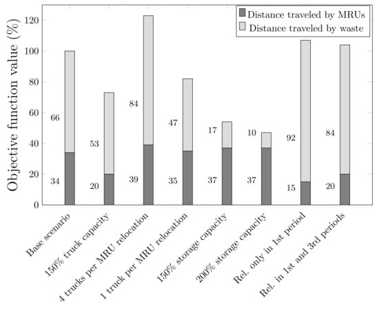 Figure 3 shows a sensitivity analysis similar to the one presented by Alarcon-Gerbier and Buscher []. In this case, however, the recycling network is composed of four MRUs and 30 nodes for a planning horizon of four periods (note that each node represents the location of a stakeholder involved in the planning). The base scenario considers a truck transport capacity of four tons, a storage capacity of 10 tons per site, and two trucks are required for the movement of one MRU. In addition, MRUs can be moved at the beginning of the four periods and we generated random instances using the same parameters as []. All our computational tests were performed on a 3.3 GHz Intel Xeon CPU with 768 GB RAM, and the solution approaches were implemented in C# programming language with Microsoft Visual Studio 2017 and Gurobi 9.0. As shown in Figure 3, increasing the transport capacity of trucks by 50% reduces the total transport distance by 27% and, thus, transport costs. Doubling the number of trucks required to move the MRUs has a negative impact on the objective function, increasing it by 23%. In contrast, in the case where an MRU fits on one truck, a reduction of 18% is achieved. One parameter that has a major impact is the storage capacity at each site. Increasing storage capacity by 50% decreases total transport distances by 46%. This is explained by the fact that considering large distributed storage capacities means that waste can be stored and processed without the need for transportation. Similarly, doubling the storage capacity decreases the target function by an additional 7%. Finally, the mobility of the units considered implies that they can be moved at the beginning of each period. This allows better results to be achieved since the degrees of freedom are increased. However, this increases the complexity of the problem and may not be technically and economically viable. Therefore, we evaluated the impact of restricting the mobility of MRUs only at the beginning of the planning. This increases the objective function by 7%. Similarly, allowing the movement of MRUs at the beginning of the first and third periods increases the total distances by 4% compared to the base scenario.