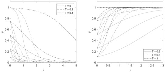 In order to simulate the dynamics of the game [], replicator dynamics Equation (4) are used. This approach allows for an investigation of the effects of trust level on the probabilities of accepting the share strategy.