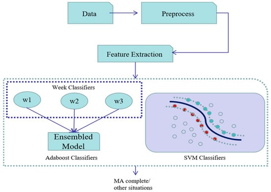 The details of steps for the AdaBoost method is shown in Table 3. First, the sample weights are initialized with uniform distribution. Then, the weak classifiers are trained with those weights. The overall classification error is calculated for updating the weights of the weak classifier. In the end, the sample weights are updated for the next iterations. We used decision tree (DT) as the individual learner.