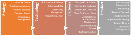 As previously indicated, setting up collaborative processes implies an associated number of barriers that may emerge when SMEs decide to collaborate. Table 1 includes the most relevant collaborative processes and some authors who have put forward solutions to deal with any barrier that may emerge during each process. One example is offered for each decision-making level in each of the identified processes to gain insight into the associated barriers when processes are collaboratively followed. At the strategical decision level, barriers in the Strategies Alignment [14] process appear because distinct partners belong to one or more network. Therefore, for each network, objectives may differ and, accordingly, the strategies to fulfil them might be misaligned. Thus, contradictions among the strategies defined by one partner may arise, which could negatively influence other network enterprises. Alignment is also emphasized by the authors of [15], who state that aligning product quality attributes in internationalized supply chains is a key element in understanding the internationalization process. At the tactical decision level, the Forecast Demand process is characterized by an evolution from independent to dependent demand [16]. To achieve this transformation, coordination mechanisms and contracts are necessary to share credible forecasts. Barriers emerge when enterprises lack collaborative mechanisms and technologies, and when exchanging information about demand, which bring about divergences in forecasts. Finally, one example of barriers at the operational decision-making level can be found in the Interoperability of processes, as enterprises have to acquire systems that exchange services and information in heterogeneous organizational and technological environments [17].