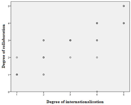 Starting with the correlation tests, in statistics, Pearson’s correlation coefficient is an index that measures the linear relation between two random quantitative variables. Pearson’s statistical, applied to the Survey A results, indicates a 0.836 positive correlation between the degree of internationalization and degree of collaboration (Table 6). It can, therefore, be stated that the two studied variables were related. In addition, the critical level (Sig. Bilateral) allowed for a decision to be made about linear independence. Therefore, as the critical level was lower than the established significant level (0.01), the dependence hypothesis was accepted. This concluded the existence of a significant linear relation. Accordingly, it can be stated that both variables were significantly correlated (Sig = 0.000).