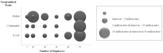 Relation among number of employees, geographical scope and turnover (according to bubble size) in the surveyed Spanish manufacturing SMEs.
