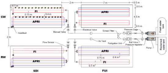 Experiment layout. CW and RW are Fresh water and Reclaimed water. DSI and FUI are Subsurface drip irrigation and Furrow irrigation. FI and APRI are Full irrigation and alternate partial root-zone irrigation.