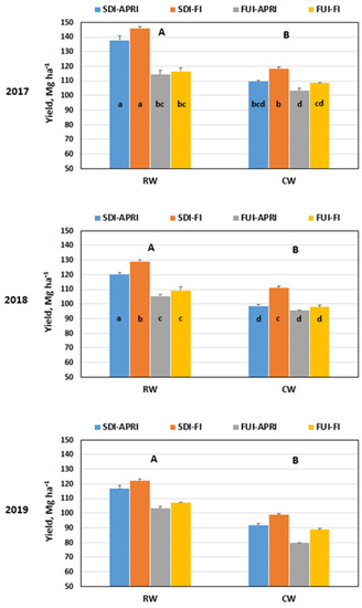 Fresh fruit yield per hectare (FW) for the different irrigation treatments throughout the three years is shown in Figure 2. Generally, the highest value of FW was obtained under RW throughout the three years. FW in 2017 (first year) ranged from 143.84 to 113.17 Mg ha−1 under RW, while it was from 117.54 to 103.20 Mg ha−1 under CW. The values of FW in the second year ranged from 126.40 to 103.05 Mg ha−1 under RW, while it was 111.13 to 94.86 Mg ha−1 under CW. In the third year, it ranged from 124.32 to 101.75 Mg ha−1 under RW, and from 98.17 to 79.83 Mg ha−1 under CW (Figure 2). The highest value was obtained under the SDI-FI, SDI-APRI, FUI-FI, and FUI-APRI, respectively, under RW and CW (Figure 2).