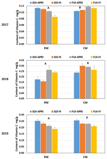 Vitamin C (VC) is an important antioxidant that represents the nutritional value of the fruit [72]. VC content in 2017 (first year) ranged from 0.114 mg g−1 to 0.086 mg g−1 under RW, while it was from 0.118 mg g−1 to 0.104 mg g−1 under CW. In 2018 (second year), the VC content ranged from 0.16 mg g−1 to 0.26 mg g−1 under RW, while it was from 0.24 mg g−1 to 0.30 mg g−1 under CW. In 2019 (third year), the VC content ranged from 0.19 mg g−1 to 0.25 mg g−1 under RW and from 0.21 mg g−1 to 0.26 mg g−1 under CW, as shown in Figure 3.