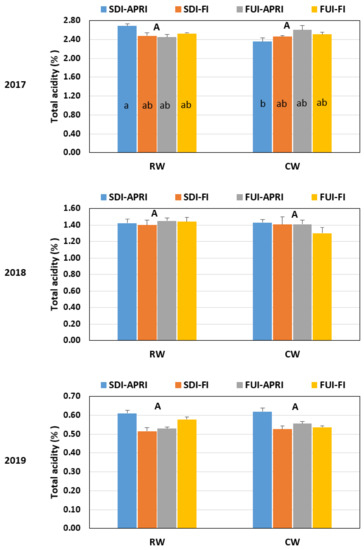 Therefore, the highest TSS value through the three years was with the APRI, both under RW and CW, which is in agreement with what [74] reported. They reported that the TSS concentrations under water-saving treatments were higher than the TSS value under full irrigation treatment, and they attributed that to a lower fruit water content, whereas the net dry matter accumulation was less affected.