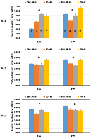 Protein Content (mg/100 g) for the different irrigation treatments in tomatoes for the three years. The different capital letters on the top of the figure represented significant differences between water types at p < 0.05. Different letters within columns revealed significant differences between irrigation treatments at p < 0.05. Bars give the means ± standard error of the mean (n = 3). RW: reclaimed water, CW: clean water, SDI: subsurface drip irrigation, APRI: alternate partial root-zone irrigation, FI: full irrigation, FUI: furrow irrigation.