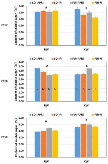 Content of soluble sugar (%) for the different irrigation treatments in tomato for the three years. The different capital letters on the top of the figure represented significant differences between water types at p < 0.05. Different letters within columns revealed significant differences between irrigation treatments at p < 0.05. Bars give the means ± standard error of the mean (n = 3). RW: reclaimed water, CW: clean water, SDI: subsurface drip irrigation, APRI: alternate partial root-zone irrigation, FI: full irrigation, FUI: furrow irrigation.