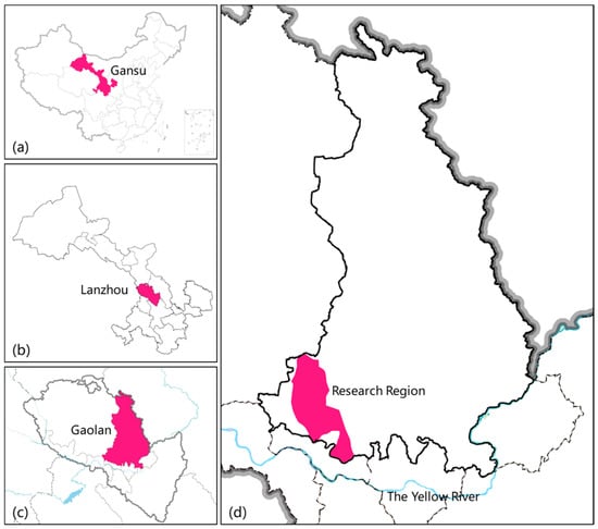 (a) Location of Gansu Province, China; (b) Location of Lanzhou City, Gansu Province; (c) Location of Gaolan County, Lanzhou City and research region; (d) Location of the research region.