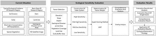 Ecological sensitivity evaluation is usually conducted according to the process of “factor selection—construction of index system—determination of factor weight—comprehensive evaluation and analysis” [6]. The whole research framework system is determined based on this process (Figure 2). First, based on available data and the background situation of the research region, current situation research is conducted to identify the present key problems and determine evaluation factors. The weights of the factors are then determined using appropriate methods, and ecological sensitivity calculations are then performed to obtain comprehensive ecological sensitivity evaluation results and ecological sensitivity areas of various levels, such as high sensitivity area, mid-high sensitivity area, mid-low sensitivity area, and low sensitivity area. Finally, to complete the application of the evaluation results, we analyze each level of area and offer matching ecological restoration strategies.