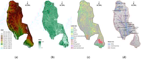 Current situation of the research region (a) Current elevation map of the research region; (b) Current NDVI of the research region; (c) Current land use map of the research region; (d) Current gully and catchment line of the research region.