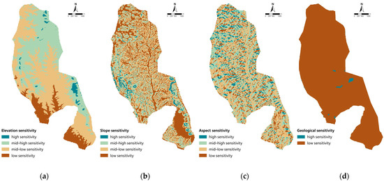 (a) Sensitivity evaluation results of elevation; (b) Sensitivity evaluation results of slope; (c) Sensitivity evaluation results of aspect; (d) Sensitivity evaluation results of geological disaster-prone area.