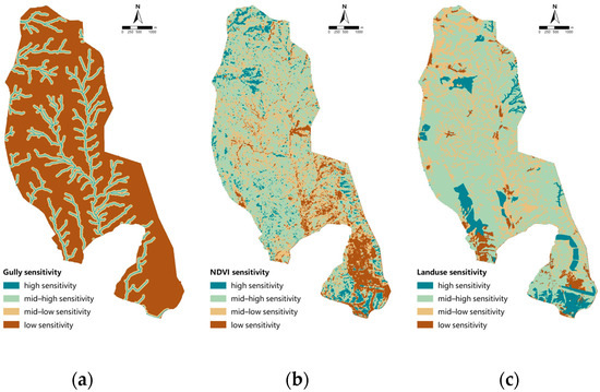 (a) Sensitivity evaluation results of gully; (b) Sensitivity evaluation results of NDVI; (c) Sensitivity evaluation results of land use.