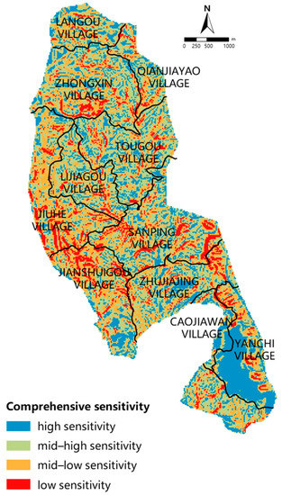 The high sensitivity areas, which are concentrated in Jiuhe Village and Jianshuigou Village in the southwest; Central Village in the north; and Sanping Village and Zhujiajing Village in the east, account for 11.16 percent of the total area in the research region. The mid-high sensitivity areas make up 29.37 percent of the total area in the research region, which are mostly found in the radiation zones of high sensitivity areas with well-dispersed distribution. The mid-low sensitivity areas account for 36.57 percent of the entire area of the research region, occupying the largest proportion of the area, and the distribution is dispersed, covering all villages in the research region, particularly Tougou Village and Sanping Village, which were the most extensively distributed. The low sensitivity areas account for 22.90 percent of the total area of the research region, which are found in the north and east, with a concentration in the urban residential area in the south.