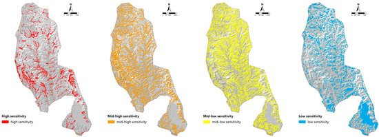 The comprehensive ecological sensitivity index of the research region ranges between 1 and 5.3044. The natural breaks classification method is adopted to reclassify the calculated results and, finally, the comprehensive ecological sensitivity evaluation results of the research region are obtained, as shown in Figure 6. The comprehensive ecological sensitivity evaluation results also suggest a significant fragmentation condition due to the research region’s mountainous topography and average vegetation coverage.