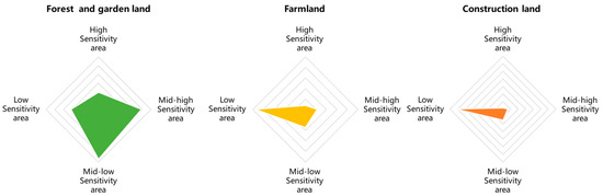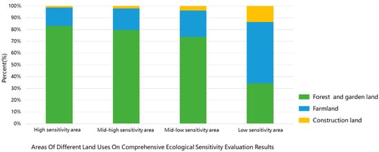 Each level of ecological sensitivity area is retrieved from the results of the comprehensive ecological sensitivity evaluation, and the results are displayed in Figure 7. The analysis of the ecological sensitivity evaluation results is conducted under three categories of land use, which are construction land formed by the combination of the third and fourth-level land; forest land and garden land represented by trees as the highest level land; and pastureland and cultivated land represented by shrubs and herbs as the second-level land, according to the classification principle in the single-factor analysis of land use types. ArcGIS overlay analysis can be used to obtain the distribution of different levels of ecological sensitivity area under diverse land uses, as illustrated in Figure 7.