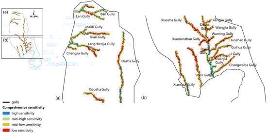 (a) North part of comprehensive ecological sensitivity evaluation results in the current gully buffer area; (b) Sorth part of comprehensive ecological sensitivity evaluation results in the current gully buffer area.