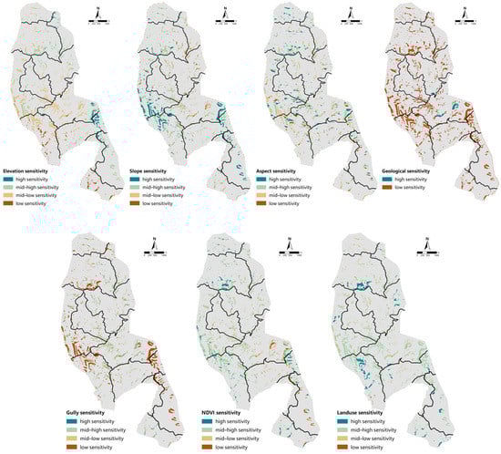 According to the comprehensive sensitivity analysis results, the high sensitivity regions are mainly distributed among Jiuhe Village, Jianshuigou Village, Sanping Village and Zhujiajing Village. We further analyzed the single-factor situation of each village, as shown in Figure 12. The actual situation of Sanping Village and Zhujiajing Village in the east is mostly hilly landform, and the area of high sensitivity regions in the site is small. However, there is land at a high altitude in the eastern edge of the site, so the main reasons for high sensitivity are elevation, slope and disaster area. Jiuhe Village and Jianshuigou Village now have more woodland inside, and their high sensitivity is mainly due to slope, landuse and NDVI. The high sensitivity regions scattered in other parts of the research site are mainly caused by aspect and gullies. Under the condition of intense precipitation, the whole situation of vegetation, slope and land use will change in the gully development zone, resulting in serious soil erosion. Because the terrain of Loess Plateau has aspect variation to a certain extent, the aspect within the research site is not aggregated but distributed over a wide area. The scattered and abundant distribution of gullies and terrain is also the main reason why the research region and Loess Plateau as a whole show highly sensitive distribution and dispersion, and each area needs different strategies for restoration.