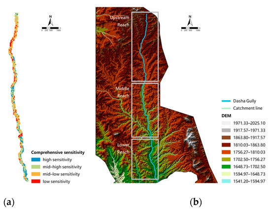 (a) Comprehensive ecological sensitivity evaluation results of Dasha Gully; (b) Ecological sections of Dasha Gully.