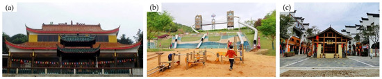 Some pictures of the three regions (a) Jiuxi Temple in Jinjing Town; (b) outdoor quality education park for children in Guangming Village; (c) the teahouse in Xunlonghe Village.