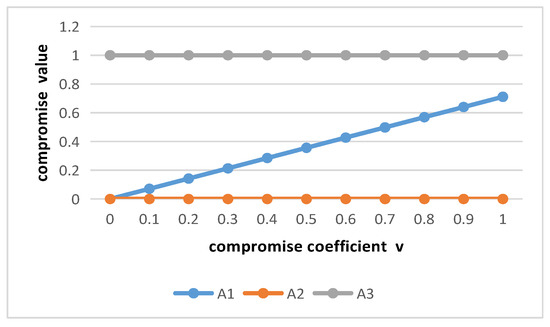 To investigate the robustness of the evaluation results, a total of 11 times are taken in v [0,1] with 0.1 as the step size for sensitivity analysis. The influence of different trade-off coefficient v on the decision-making results was calculated, as shown in Figure 3.