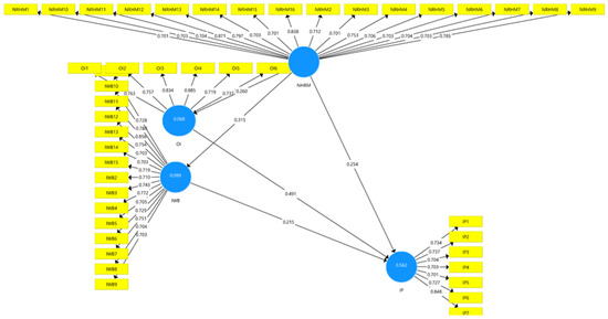 Measurement model with effects size (B-value). Notes. NHRM = New Human Resources Management; OI = Organizational Innovation; IWB = Innovative Work Behavior; IP = Innovation Performance.