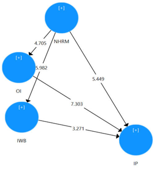 Results were based on bootstrapping with 5000 subsamples (two-tailed). Figure 2 and Figure 3 show more explanationd for the relation (the T value) and indicate an increase in the units (the R square)—Figure 2 shows that 1.00 units increase in NHRM will result in 0.254 units increase in innovation performance, 0.260 units increase in organizational innovation, 0.315 units increase in innovative work behavior. A 1.00 unit increase in organizational innovation will result in 0.491 units increase in innovation performance, while a 1.00 units increase in innovative work behavior will result in 0.215 units increase in innovation performance.