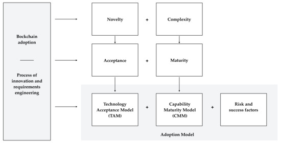Adoption is understood as a process of innovating, and the relevant aspects of this process are acceptance and maturity. Acceptance is a decision-based process, which is determined by user attitudes, values, and users’ intention to use a system or a technology [10]. Maturity can be understood as various stages of evolution, which users move through in complex environments. It shows the degree to which any novel aspects of a business are applied across the process [11]. Together, the integration of acceptance and maturity (TAM and CMM) describe and manage user behaviors and stages throughout the innovation process and are therefore key for sustainable and successful blockchain adoption.