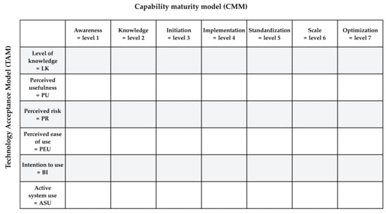 Based on the conceptual framework as seen in Figure 1, we designed the novel “TAM + CMM Adoption Model”, which includes seven levels on the x-axis and six levels on the y-axis.