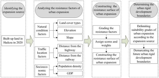 First, the MCR model was used in this study to define future urban rigid development boundaries of Haikou. The MCR model was first proposed by Dutch ecologist Knaapen in 1992 [22]. Its essence was the minimal resistance to be overcome from the source to the target location, which reflected a kind of accessibility [23]. After modification by Chinese scholars, this model was mostly employed for the distribution suitability of rural settlements [24,25] and ecological security pattern construction [26,27] in many studies. As the rigid boundary is the area that cannot be occupied by urban construction land, the ecological bottom line that cannot be exceeded by urban expansion, and the upper limit of ecological environment capacity and resource carrying capacity, urban development is affected by many resistance factors. Therefore, the MCR model is now also mostly used to demarcate future urban rigid development boundaries. The calculation formula is as follows: