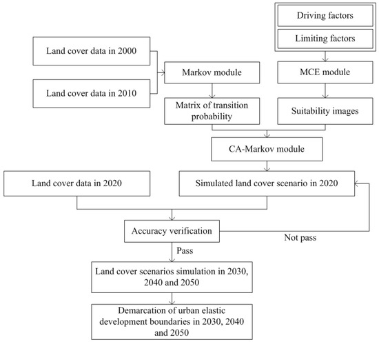 Workflow of demarcating future urban elastic development boundaries based on CA–Markov model.