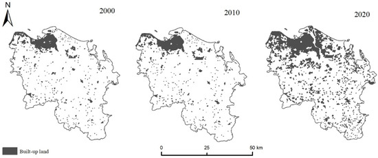 Taking land cover data of Haikou in 2000, 2010, and 2020 as data sources, artificial surface (i.e., built-up land) patches were extracted by using ArcGIS to obtain the spatial distribution of built-up land in Haikou in the three years (Figure 4). From 2000 to 2020, the area of built-up land in Haikou showed a trend of continuous increase. According to the statistics, the areas of built-up land in Haikou in 2000, 2010, and 2020 were 120.39, 134.35, and 333.76 km2, respectively.