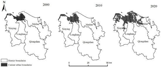 Although built-up land in Haikou covered the urban built-up area to a certain extent, there was still redundant land use information belonging to industrial and mining land, and the built-up land of surrounding villages and towns, which could not extract the complete and closed boundary of the urban built-up area. Therefore, by referring to Landsat remote-sensing images covering Haikou in 2000, 2010, and 2020, and combining them with the spatial distribution of built-up land in Haikou, the outer envelope surfaces of urban built-up area in Haikou in 2000, 2010, and 2020 were obtained by manual visual interpretation (Figure 5). According to the statistics, the urban built-up areas of Haikou were 93.71, 124.26, and 260.41 km2, respectively, and the increase rates for urban built-up areas of Haikou were 3.05 km2 per year and 13.62 km2 per year, respectively, in the two decades.