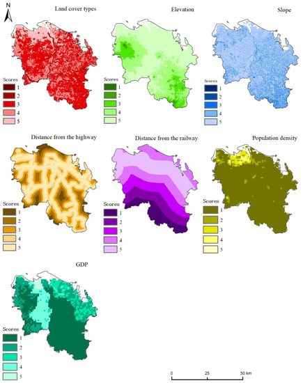 In this study, seven factors were selected as the resistance factors of future urban development in Haikou from the three aspects of natural condition, traffic location, and social and economic factors, including land cover types, elevation, slope, distance from highways and railways in 2020, population density in 2020, and GDP in 2015. In general, the lower the elevation is, the lower the slope, the more convenient the traffic, the greater the population density, the more developed the economy, the less the resistance of urban expansion, and the more suitable for urban development. Conversely, the greater the resistance to urban expansion is, the more unsuitable for urban development it is. Thus, the grades and scores of natural condition factors were determined by referring to existing studies, and transportation factors, population density, and GDP were graded and scored by Natural Breaks method (Table 1). The higher the scores are, the less the resistance of urban expansion is. Next, the Analytical Hierarchy Process (AHP) was used to determine the weights of seven resistance factors (Table 2).