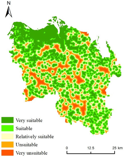 First, the above seven resistance factors were classified according to the grades in Table 1 and are shown in Figure 6. Then, the resistance surface was obtained by calculating the weights of the seven resistance factors. Next, the Cost Distance tool in ArcGIS software was used to combine the expansion source, built-up land of Haikou in 2020 with the resistance surface to obtain the accumulated cost of urban expansion. Lastly, the natural breaks method was used to classify the suitability grades of future urban development in Haikou according to the cumulative resistance values: very suitable, suitable, relatively unsuitable, unsuitable, and very unsuitable (Figure 7). The area and proportion of five suitability grades are shown in Table 3.