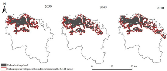 Figure 9 shows changes in urban built-up land and internal area of development boundaries in Haikou from 2030 to 2050 simulated by the MCR model. In 2030, 2040, and 2050, the areas of urban built-up land in Haikou are 343.26, 403.88, and 422.59 km2, respectively, and the areas of urban rigid development boundaries are 361.27, 480.17, and 505.22 km2, respectively. In the next two decades, the areas of urban rigid development boundaries would increase by 118.90 and 25.05 km2, respectively. As the urban built-up area of Haikou was 260.41 km2 in 2020, the reserved space for urban development by 2030, 2040, and 2050 would be 100.86, 219.76, and 244.81 km2, respectively, according to the rigid development boundaries.
