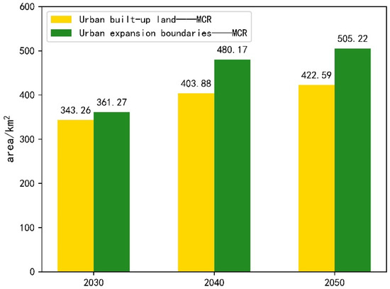 Area of future urban built-up land and rigid boundaries in Haikou based on the MCR model.