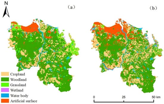 (a) Simulated land cover scenario and (b) actual land cover data of Haikou in 2020.