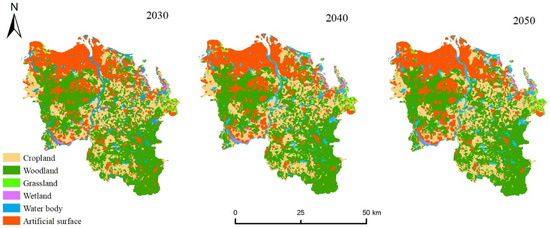 Land cover scenarios of Haikou in 2030, 2040, and 2050 simulated by CA–Markov model.