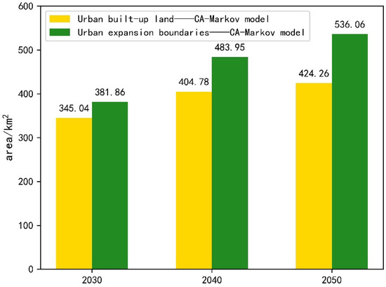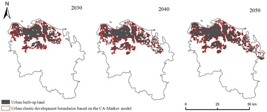 By using the CA-Markov model, the areas of urban elastic development boundaries in 2030, 2040, and 2050 would be 381.86, 483.95, and 536.06 km2, respectively, representing the development line of urban internal demand for some time to come.