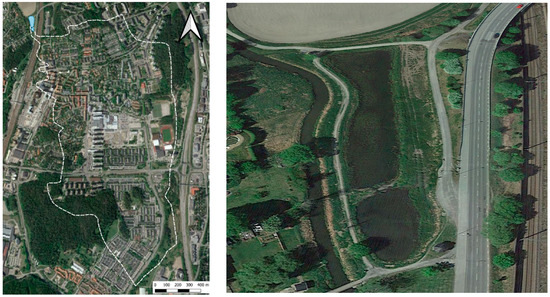 The stormwater runoff and baseflow from the catchment area are drained to the Ladbrodammen stormwater management facility, constructed in 2003. The facility consists of three components: an upstream balancing basin storing pumped-in stormwater and baseflow, and, depending on the water depth in the basin, water is discharged either through or over a porous macadam barrier into the main pond or the adjacent wetland area. When the detention pond is full, water discharges over an outflow weir directly to the Väsbyån stream [19]. The combined capacity of the two pumps filling the balancing basin is 160 L/s; when the catchment runoff exceeds this capacity, the excess drains directly into the receiving stream Väsbyån. The volume of such bypasses was estimated at 25–35% of the annual catchment runoff and baseflow [20]. The rate of interception of annual runoff may appear low by today’s standards, but it was constrained by several factors, including the lack of space for stormwater management facilities and the costs of pumping stormwater into the pond. The main treatment process in the facility is stormwater settling in the main pond having a surface area of 5500 m2, permanent storage of 3700 m3, and a dynamic storage of 500 m3, with the outflow throttled by a weir.