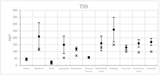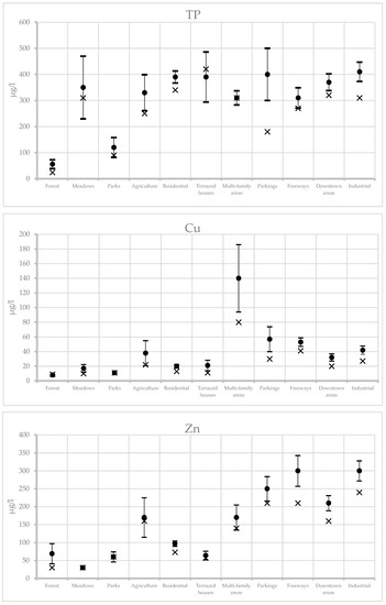 - Mean concentrations of the water quality constituents varied among the subcatchments with various land uses by about an order of magnitude, as also reported in [30]. Both Cu and Zn concentrations were the highest in runoff from industrial and trafficked areas. When comparing residential areas with various density of development, multifamily areas displayed higher concentrations of Cu and TSS, possibly because of higher traffic, and in the case of Cu, more frequent use of copper roofs, compared to lower density single-family residential areas. The concentrations of Cu and Zn were the lowest in rural or green lands, including forests, meadows, parks, and agricultural lands. On the other hand, the median concentrations of TP were higher in single-family areas with more greenery and a higher use of fertilizers.