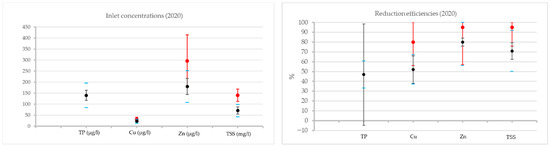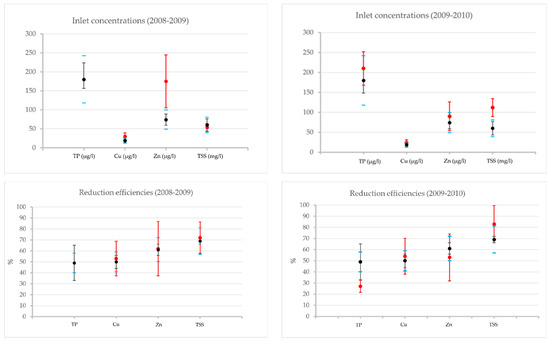 Figure 4 displays calculated mean inflow concentrations and reduction efficiencies with uncertainty bands expressed in concentration units, derived from the calculated RSE (%) in the StormTac database data (black markers). The diagram is complemented with measurements and estimated measurement errors (red markers) and uncertainties calculated by assuming a constant relative uncertainty for all land uses and constituent concentrations in stormwater and baseflow, according to the simplified method described in [10] (short blue dashes).